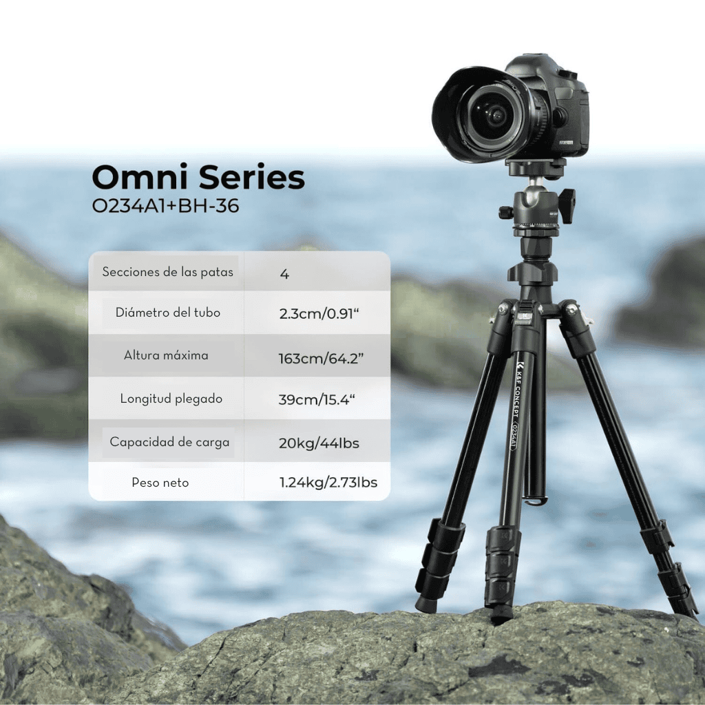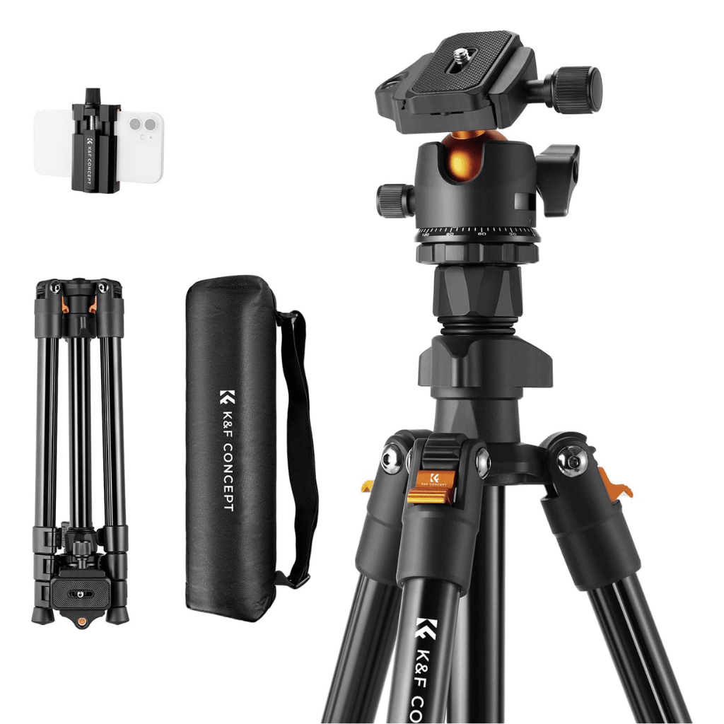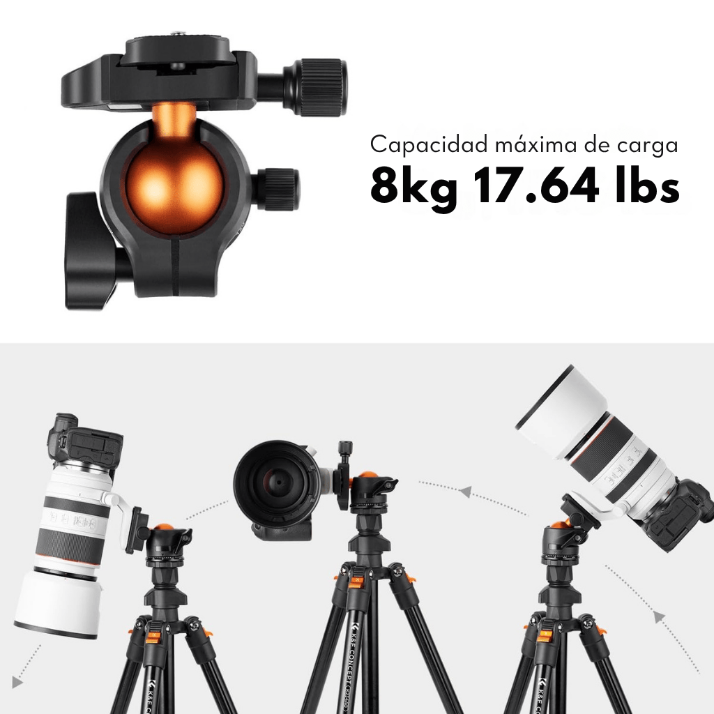 Trípode de cámara K&F Concept de 163 cm, ligero y portátil, ideal para fotografía y video en exteriores. Con cabezal de bola panorámico de 360° y gran capacidad de carga, ofrece estabilidad, versatilidad y compatibilidad con una amplia variedad de dispositivos.
